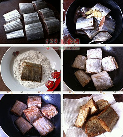 2、腌制好的带鱼薄薄地沾上一层面粉,平底锅用油滑好,逐块放入带鱼,待一面煎黄后翻个煎另一面。