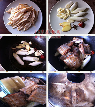 6、一分钟后再倒入适量冷水、盐、白糖以及泡好的腐竹,盖上锅盖炖至入味后转大火收汁即可。
