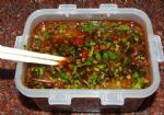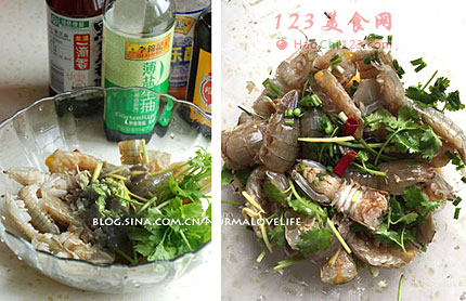3、再加辣椒、葱、姜、香菜、醋,调味汁,和爆香的蒜油一起混合腌制濑尿虾,冷藏3小时后即可食用。