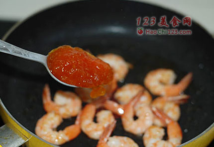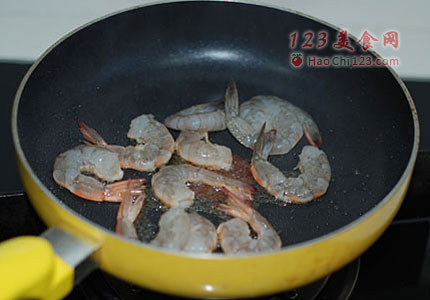 2、热锅入少许橄榄油,放入腌制好沥干的虾仁,煸炒至变色。