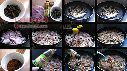 3、加入切好的洋葱同炒,此时可加点酱油调色了,洋葱不易炒倒,要加点水焖煮。