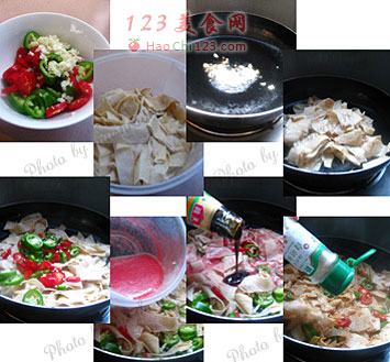 3、加入青红椒一起煸炒片刻,加入西红柿汁同炖。