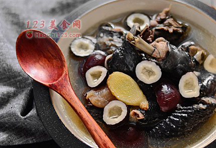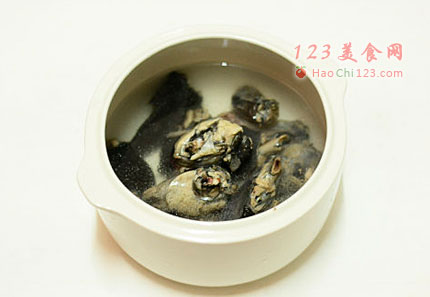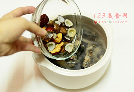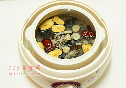 6、放入炖锅内,隔水炖,高火先煮沸,再调至慢火炖煮3~4小时,最后放入少许盐调味(所谓“三煲四炖”,指煲汤最多三小时,炖汤最多四小时,时间过长反而会使汤中氨基酸类营养变质,营养成分变相流失)。