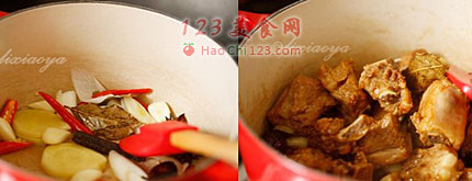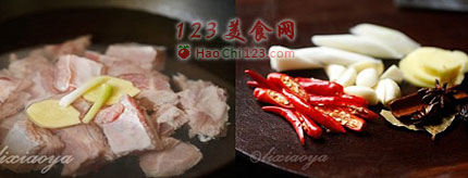 2、锅内注入少量油,加入所有辅料炒香,加入排骨炒均,烹入生抽(若想色重些就加点老抽)和少许冰糖上色和调味后加入没过排骨的热水大火炖煮。