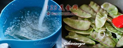 3、煮的过程中将粉皮用剪刀剪成大块并用水浸泡着,油豆角撕去两端的尖和老筋,清洗干净后入油锅炒至变色盛出备用。