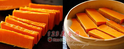 7、排骨下面的南瓜也蒸得软软糯糯的,肉汁浸入南瓜,让原本就香甜可口的南瓜又多了一份肉香。