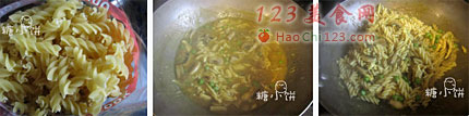 9、意面煮至还有一点点的白芯的时候,就可以捞出了,放到咖喱酱锅里面拌匀即可。