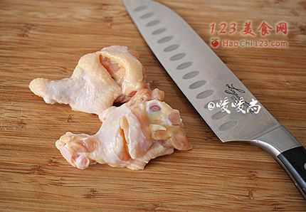 3、浸泡后的鸡翅根用刀在肉多的部位划两刀方便烧的时候入味。