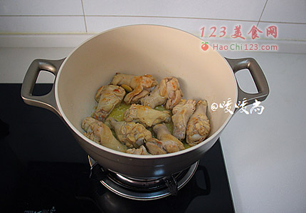 4、锅内放适量的花生油,油温热后下姜片煸炒出香味,然后放擦干水分的鸡翅根。中小火煎至边缘出现焦黄色。