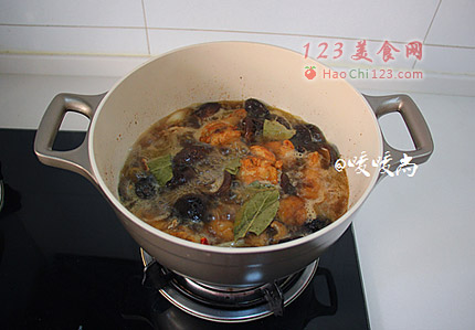 6、下泡发后的香菇,翻炒均匀后,加入600ml的水没过鸡翅根,下香叶、八角,盖上锅盖大火煮开转小火炖40分钟。