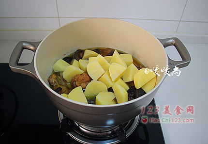 7、40分钟后下土豆块,调入盐和生抽,盖上锅盖继续小火炖20-30分钟。
