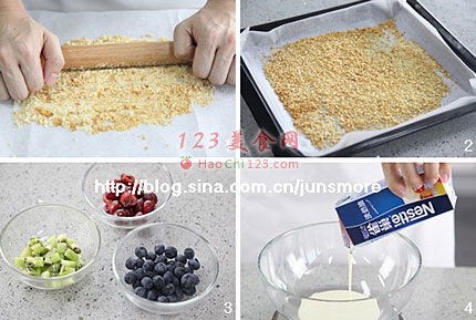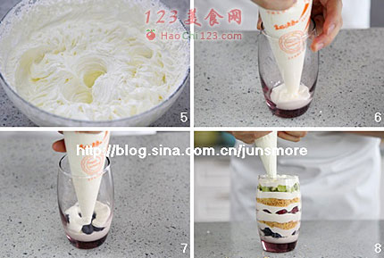 7、铺上一层蓝莓,再挤一层淡奶油。