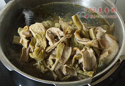 4、加两片生姜;加处理好的笋干。
