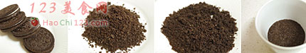 2、选个咖啡杯,容量不要太大,在杯子底部铺上巧克力饼干碎,可以很随意的制作,不必苛求平整。