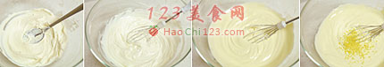 4、再加入适量的柠檬皮碎,选黄柠檬,磨一些细细的柠檬皮碎,或者用刀切也可以,避免磨到白色部分,大概磨到半个柠檬的量就够了,如果觉得还不够可以再加入柠檬汁,多一点柠檬味很好吃。