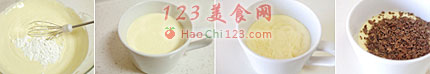 6、然后放入微波炉,高火加热1分半,一杯加热1分半,两杯2分半的时间,加热后表面看起来并不是很漂亮,没关系,放入冰箱冷藏一下,取出磨一些黑巧克力碎片撒在上面,多一些巧克力碎片,既漂亮又好吃。
