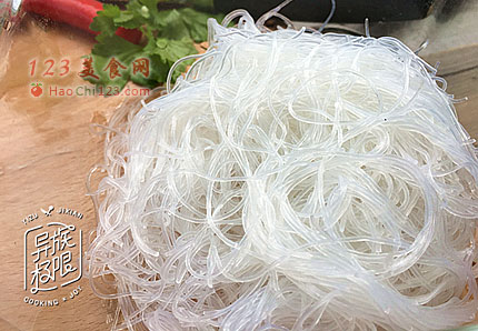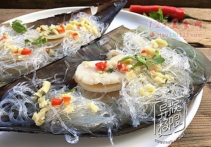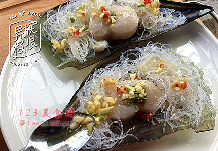6、将浸泡过的粉丝盘绕在带子(鲜贝)肉边上;调好的酱汁淋到带子(鲜贝)和粉丝上。