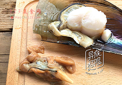2、去除带子的内脏,留取贝肉和裙边。