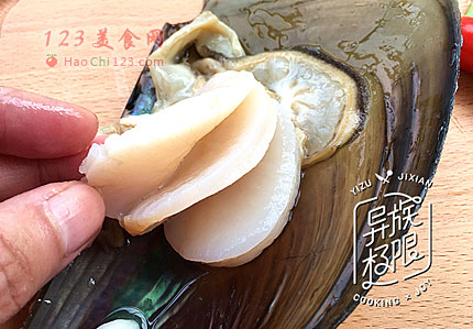 3、贝肉洗净后,用刀将它切成风琴状。