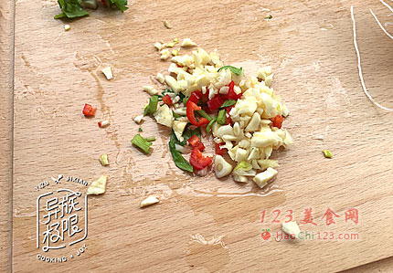 4、大蒜去皮,与辣椒、芹菜分别剁成蓉。