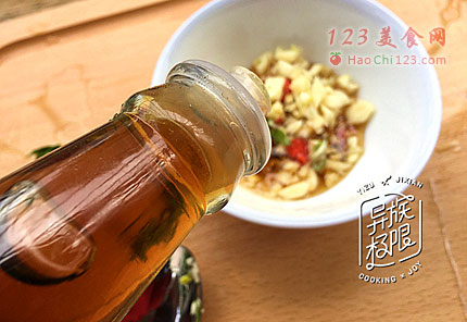 5、蒜蓉调料装碗后加入鱼露、凉白开水(1:1)和食用油调成酱汁。
