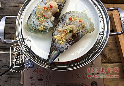7、电磁炉上起锅,选“桑拿蒸/其它”功能将水煮开,带子(鲜贝)装盘放在蒸屉上,蒸5分钟。