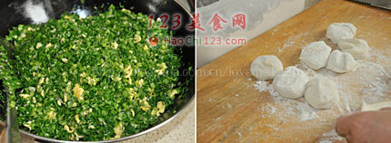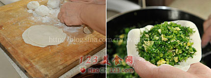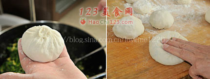 4、包的时候就像包包子一样,把馅儿都包进去,封好口,然后口朝下,烙的时候也口朝下。