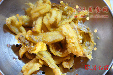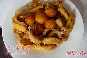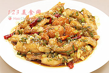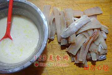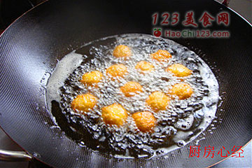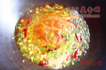 7、炒制一个卤汁:起锅放油,爆香葱姜蒜末,加入清水、酱油、料酒、醋、盐,熬开后,加入淀粉勾芡,浇在土豆丸子及炸好的带鱼上面。