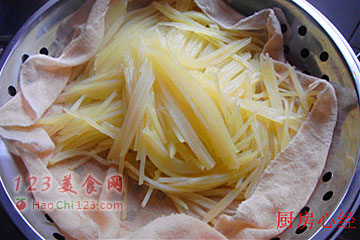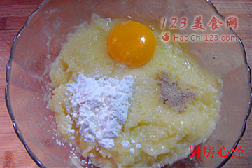 4、将土豆碾成泥,加入淀粉、鸡蛋、胡椒粉拌匀。