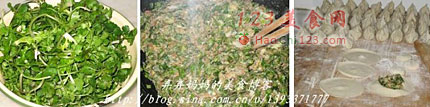 4、开始准备包饺子前,混合羊肉馅儿和芫荽碎末,将它们拌均匀,不要再加盐了。