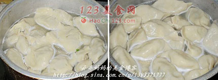 8、这就是我们常说的“盖盖煮馅儿,开盖煮皮”;统共煮三开,点两到三次水(饺子大点三次,饺子小点两次);第一次开锅,饺子就应该全部浮到水面。