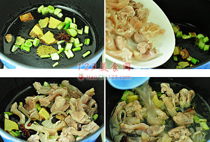 3、锅中放油,下葱姜和香料爆出香味,加入煮过的蹄筋翻炒一下。