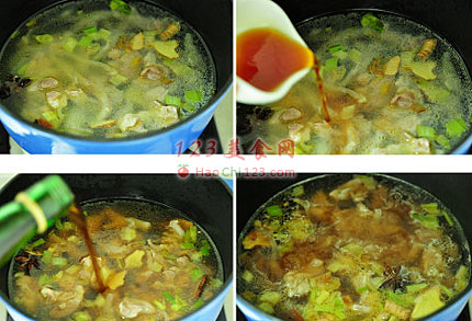 3、加水炖煮时不同的锅水分蒸发的速度不同,通常我用炒锅加盖炖肉时,同样的水量,较短的时间就耗完了,用砂锅或铸铁锅时则水量减少的比较慢,这道菜的水量是按铸铁锅的标准,如果用炒锅复制,可能需适当增加水量。