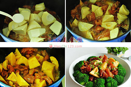 2、配菜可以选你喜欢的任何品种,莲藕、土豆、千张结等等。如果用笋,预处理很重要,用沸水汆和冷水泡的方式把草酸的艰涩味道充分去除,冬笋和春笋更适合入这类菜。