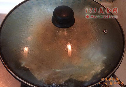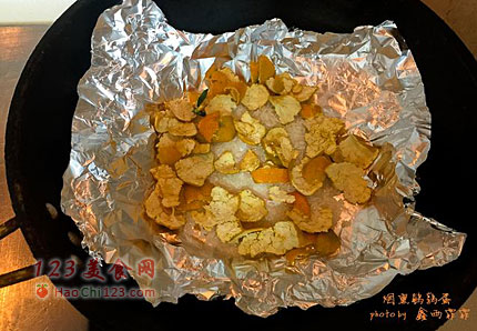 4、锅内放锡纸,放一层黄糖,一层大米,一层橘皮。