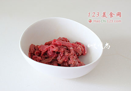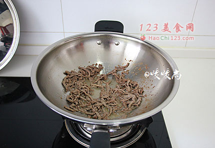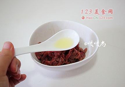 2、炒牛肉之前再加一小勺花生油到牛肉丝里,抓匀。这样炒的时候肉丝就不会那么容易粘在一起了。