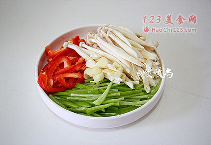 3、海鲜菇洗净稍稍攥一下水分,尖椒、彩椒洗净切丝,大蒜切片。