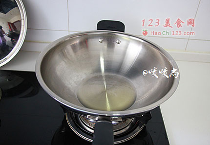 4、炒锅提前烧热,然后下比平时炒菜多一些的花生油。