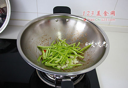 6、利用锅底余油,下蒜片炒出香味。下尖椒丝,翻炒均匀。