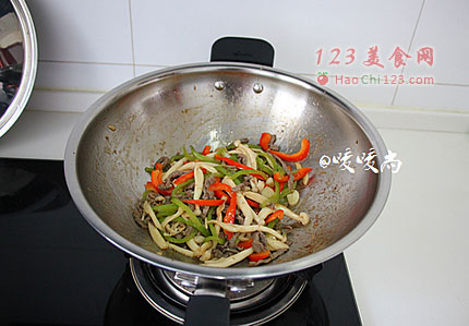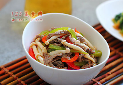 7、下海鲜菇,调入2g的盐翻炒至海鲜菇变软。下红椒丝和炒好的牛肉丝,调入一大勺蚝油。快速的翻炒均匀即可出锅。