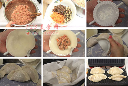 3-7、将饺子器用面粉铺一下,然后放上饺子皮,放上饺子馅,用手沾水在边缘划一圈,夹紧饺子器即可。