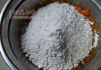 2、把蒸好的南瓜碾压成泥,晾凉;追求完美口感的,可以用料理机搅打;晾凉后的南瓜泥加酵母和白糖,喜欢的,这里还可以添加牛奶或者鸡蛋,不过那样就要减少南瓜泥的用量了。水分多,发糕的口感偏湿,水分少,发糕的口感干爽。