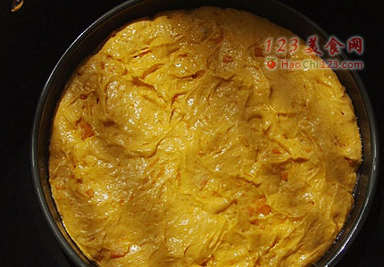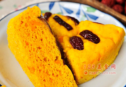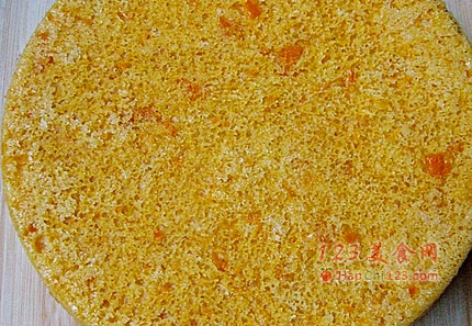 9、取出盘子,晾一下,不烫手后,先用手把发糕从盘子边上一下下抻拉开,然后就可以完整倒扣在板上;像不像漂亮的蛋糕?