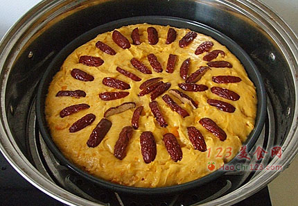 8、看盘内的面糊膨胀到原来的1.5至2倍左右,看起来很蓬松就可以了,把红枣随意嵌入面糊;放入蒸锅,冷热水下锅均可,我习惯用冷水下锅。大火烧开后转中火,继续蒸25分钟关火,虚蒸5分钟开锅;我的披萨盘是9寸的。