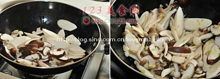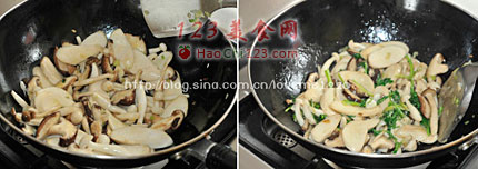 3、放入处理好的蘑菇,翻炒出香味。