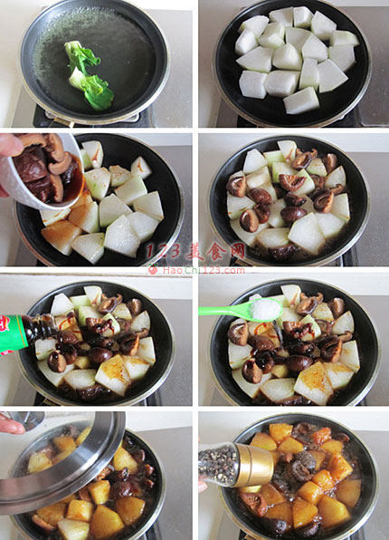 3、冬瓜表面煎的微微发黄时加入泡好的香菇和水。