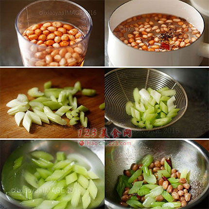 3、芹菜和花生入料理盆中,加入香油、少许盐、糖拌均即可。