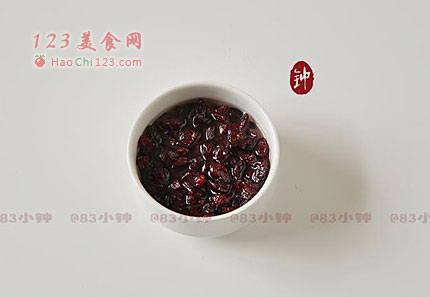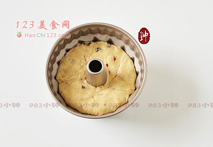 6、咕咕霍夫模具底撒少许蔓越莓干,松弛好的面团用手指在正中间戳个洞,套进去稍作整形(对自己的模具不是太有信心的话可以提前抹一层黄油,我用的这款不需要抹)。