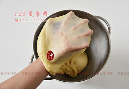 3、加入软化好的黄油,揉成能拉出薄膜的面团。