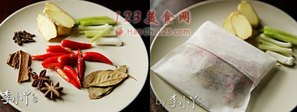 2、煮牛筋的时候开始准备配菜和香料,八角、桂皮、香叶、丁香,用水稍冲下装入汤渣袋内,葱切段,姜切片备用。
